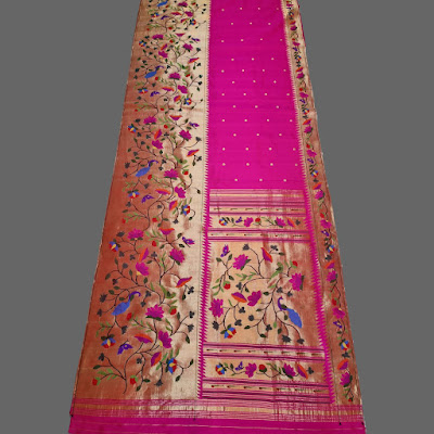 Paithani sarees originated from the town of Paithan in Aurangabad, Maharashtra. They are celebrated for their detailed motifs of peacocks, parrots, and flowers, woven in real silk with golden zari. Over time, Paithani became a symbol of royal attire and artisan excellence across India.