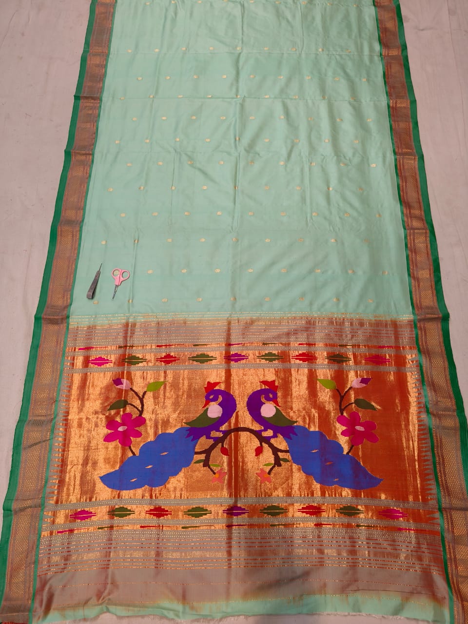 Craftsmanship: The process of creating a custom border Paithani saree is labor-intensive and time-consuming. It involves a combination of handloom weaving and precision handwork, often taking months to complete a single piece.